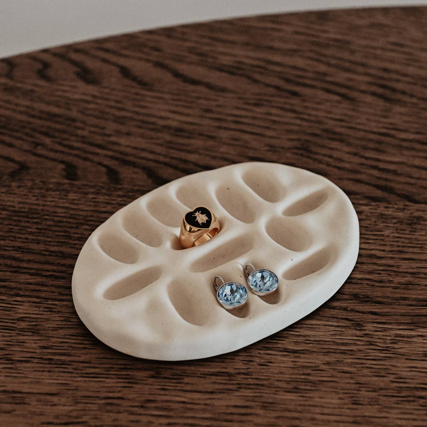 Su forma orgánica con cavidades redondeadas lo convierte en un accesorio ideal para organizar anillos, pendientes y pequeños tesoros, manteniéndolos siempre a mano con estilo.